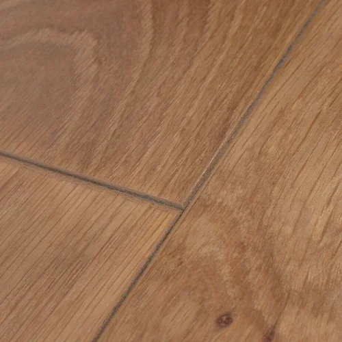 The Diamond Click Oak floor is made with a real, thin layer of wood on top. What makes it special is an incredibly tough, clear coating we’ve developed. This coating is so strong that the floor resists scratches, stains, and wear far better than other wood floors—even those with the toughest standard finishes. It keeps its beautiful look for many years without needing to be sanded or refinished, unlike solid wood or other laminate floors, which can show wear much faster. (98 words)